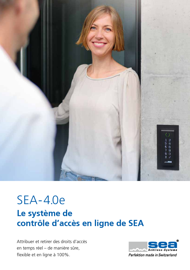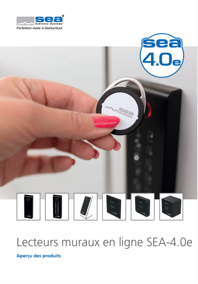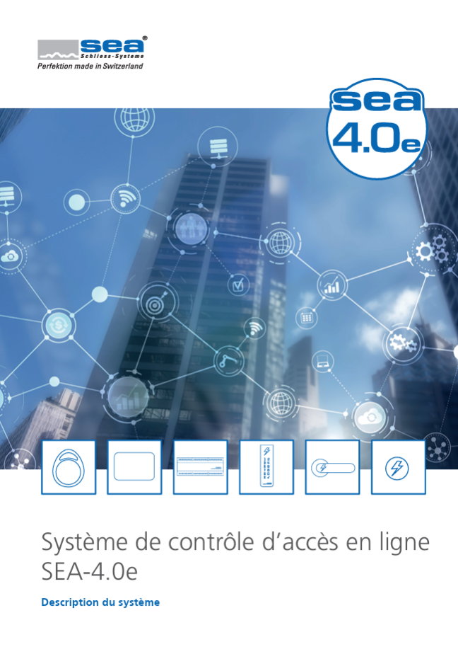 SEA-4.0e est un système électronique de contrôle d'accès en ligne. Il se compose d'un logiciel de gestion basé sur un navigateur, d'un ou plusieurs contrôleurs et de lecteurs d'accès adaptés (lecteurs muraux, lecteurs à poignée, boutons et serrures d'armoire). Les contrôleurs disposent d'un serveur web intégré et peuvent communiquer en temps réel avec tous les composants en ligne. Des supports RFID (MIFARE DESFire) sont utilisés pour l'accès.